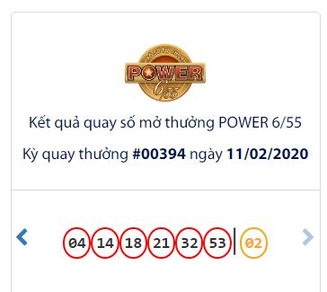 Bộ số may mắn trong kỳ quay thưởng lần này là: 04-14-18-21-32-53. Trong kỳ quay thưởng thứ 394 của xổ số Vietlott loại hình Power 6/55, Vietlott không tìm ra khách hàng may mắn trúng thưởng giải Jackpot 2 trị giá 55.406.377.200 đồng.