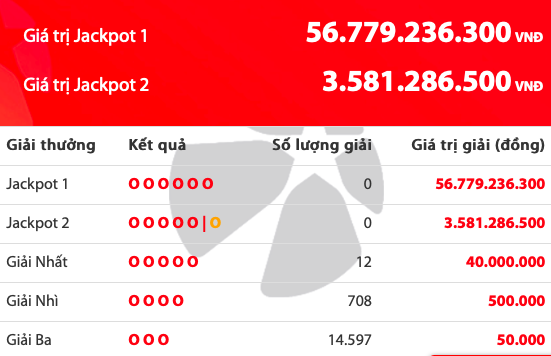 Theo thể lệ Vietlott, do kỳ quay thưởng 356 đã không tìm ra chủ nhân của giải độc đắc nên số tiền hơn 56 đồng sẽ được cộng dồn vào giải Jackpot trong kỳ quay thưởng tiếp theo. Nếu cộng thêm tiền bán vé số, chủ nhân giải Jackpot 1 trong kỳ quay thưởng tới đây có thể nhận được số tiền lên đến 58 tỷ đồng.
