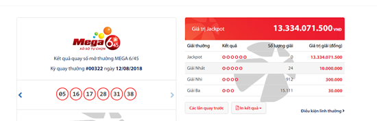 Theo thông tin mới nhất từ Công ty xổ số điện toán Việt Nam (Vietlott), kỳ quay thưởng thứ 322 của xổ số Mega 6/45 mở thưởng ngày 10/8 đã không tìm ra chủ nhân của giải Jackpot trị giá 13.334.071.500 đồng.