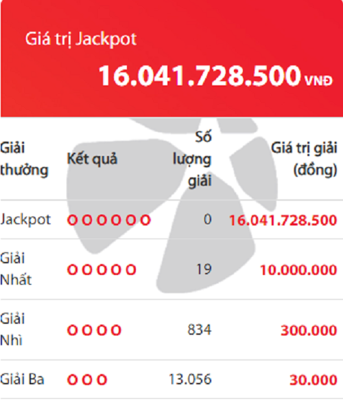 Theo thông tin mới nhất từ Công ty xổ số điện toán Việt Nam (Vietlott), tại kỳ quay thưởng thứ 468 của xổ số Vietlott loại hình Mega 6/45 mở thưởng ngày 19/7 đã không tìm ra chủ nhân của giải Jackpot trị giá 16.041.728.500 đồng.