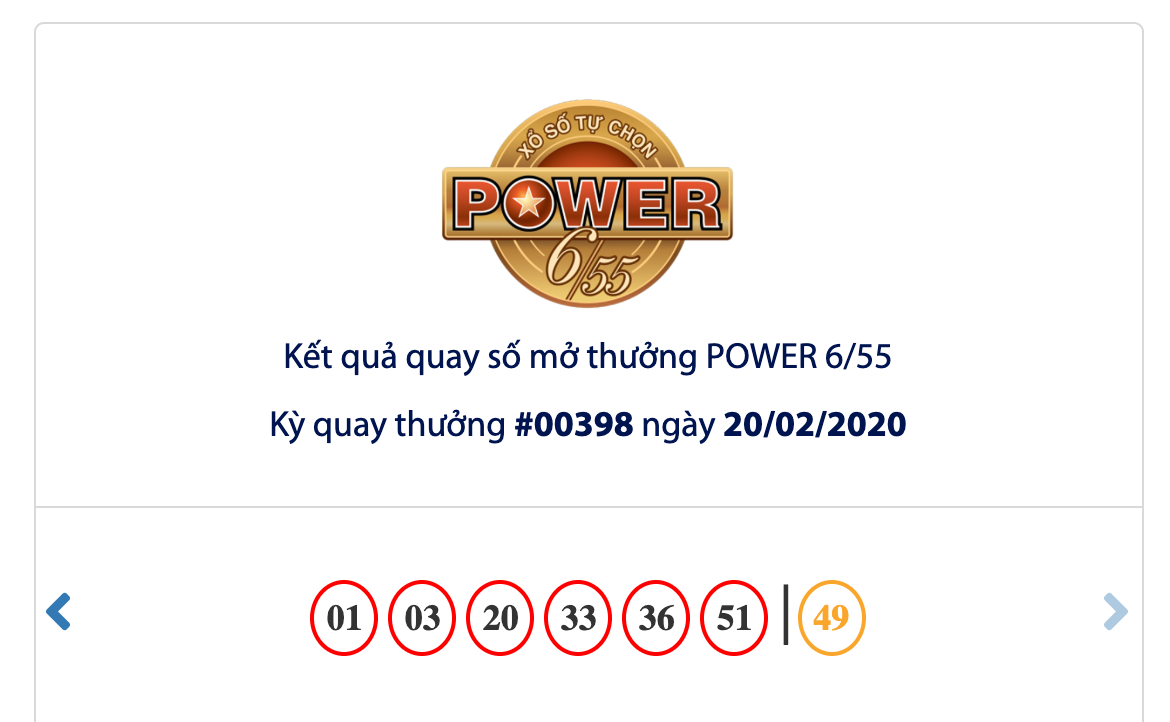 Bộ số may mắn trong kỳ quay thưởng lần này là: 01-03-20-33-36-51-49. Trong kỳ quay thưởng thứ 398 của xổ số Vietlott loại hình Power 6/55, Vietlott không tìm ra khách hàng may mắn trúng thưởng giải Jackpot 2 trị giá 4.379.738.600 đồng.