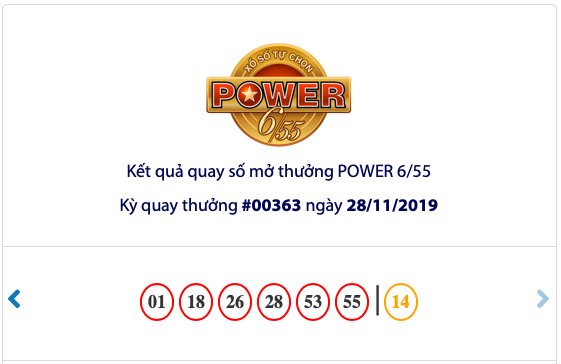 Bộ số may mắn trong kỳ quay thưởng lần này là: 01- 18- 26- 28- 53- 55. Trong kỳ quay thưởng thứ 363 của xổ số Vietlott loại hình Power 6/55, Vietlott đã tìm ra 01 khách hàng may mắn trúng thưởng giải Jackpot 2 trị giá 3.209.152.250 đồng. Con số may mắn để trúng giải jackpot 2 của xổ số Vietlott là số 14.