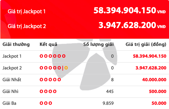 Theo thể lệ Vietlott, do kỳ quay thưởng 3269 đã không tìm ra chủ nhân của giải độc đắc nên số tiền hơn 58 đồng sẽ được cộng dồn vào giải Jackpot trong kỳ quay thưởng tiếp theo. Nếu cộng thêm tiền bán vé số, chủ nhân giải Jackpot 1 trong kỳ quay thưởng tới đây có thể nhận được số tiền lên đến 59 tỷ đồng.
