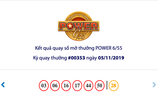 Bộ số may mắn trong kỳ quay thưởng lần này là: 03- 06- 16- 17- 44- 50. Trong kỳ quay thưởng thứ 353 của xổ số Vietlott loại hình Power 6/55, Vietlott đã tìm ra 01 khách hàng may mắn trúng thưởng giải Jackpot 2 trị giá 5.241.750.900 đồng. Con số may mắn để trúng giải jackpot 2 của xổ số Vietlott là số 28.