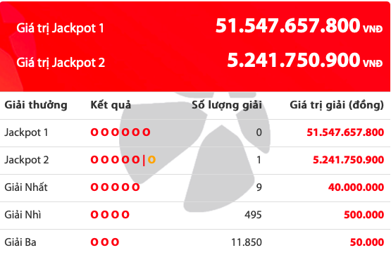 Theo thông tin mới nhất từ Công ty xổ số điện toán Việt Nam (Vietlott), kỳ quay số mở thưởng thứ 353 xổ số Power 6/55 mở thưởng ngày 5/11 đã không tìm ra chủ nhân của giải Jackpot 1 trị giá 51.547.657.800 đồng.