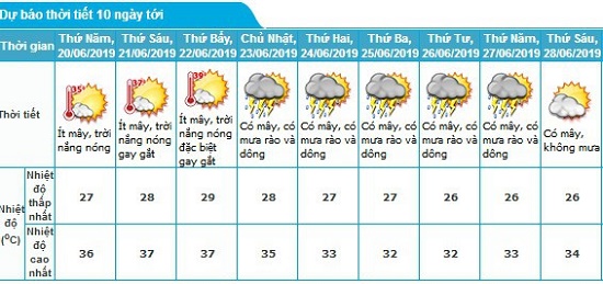 Dự báo thời tiết hôm nay (19/6), do ảnh hưởng của vùng áp thấp nóng phía Tây với đới gió Tây Nam gây hiệu ứng phơn nên ở khu vực Trung Bộ tiếp tục có nắng nóng, có nơi nắng nóng gay gắt với nhiệt độ cao nhất phổ biến 35-37 độ, có nơi trên 38 độ.
