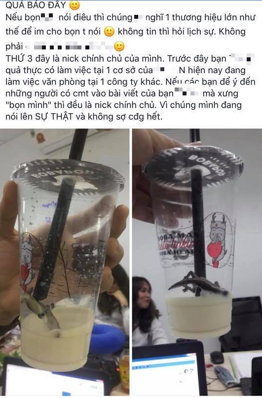 | Hình ảnh ly trà sữa có thạch sùng và phản hồi từ bên cửa hàng sau khi làm việc (Ảnh: Mạng xã hội) |