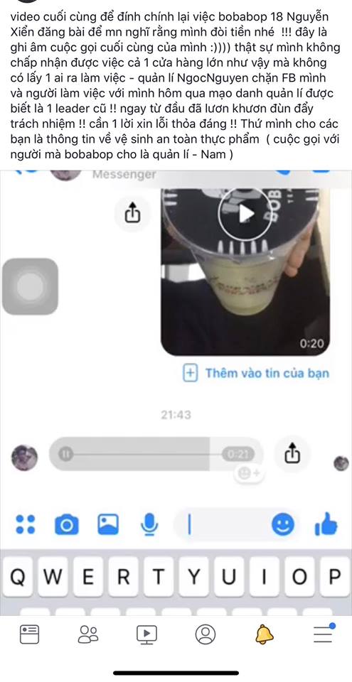 Khi nhận được nhiều luồng ý kiến từ cộng đồng mạng, T. chia sẻ thêm về trải nghiệm đáng sợ của mình và nỗi bất bình trong việc bị "tố" ngược: "Video cuối cùng để đính chính lại việc bobabop 18 Nguyễn Xiển đăng bài để mn nghĩ rằng mình đòi tiền nhé !!! Đây là ghi âm cuộc gọi cuối cùng của mình, thật sự mình không chấp nhận được việc cả một cửa hàng lớn như vậy mà không có lấy một ai ra làm việc - quản lí NgocNguyen chặn FB mình và người làm việc với mình hôm qua mạo danh quản lí được biết là 1 leader cũ !! Ngay từ đầu đã lươn khươn đùn đẩy trách nhiệm !! Cần 1 lời xin lỗi thỏa đáng !! Thứ mình cho các bạn là thông tin về vệ sinh an toàn thực phẩm (cuộc gọi với người mà bobabop cho là quản lí - Nam)."