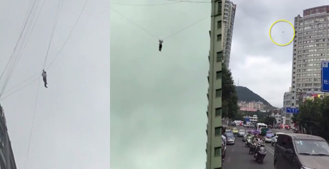 Cư dân huyện Panzhou tỉnh Quý Châu đã bị sốc thật sự khi nhìn thấy một người đàn ông, rõ ràng không phải vận diễn viên nhào lộn chuyên nghiệp, đang treo mình lủng lẳng trên đường dây thông tin nối giữa hai nhà tòa nhà cao tầng.