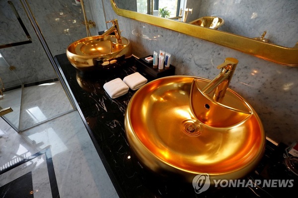 Tất cả bồn tắm, bồn rửa mặt, thậm chí là bồn cầu,... của khách sạn Golden Lake ở Hà Nội, Việt Nam đều được dát một lớp vàng rất bắt mắt.