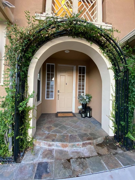 Cửa nhà được trang trí với cây cối xanh um tùm mọc xung quanh. |