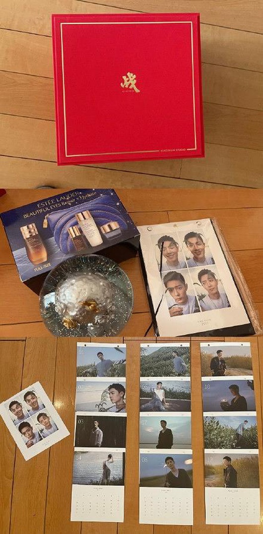 Tiêu Chiến tặng truyền thông một set dưỡng mắt kèm dưỡng da từ thương hiệu Estee Lauder, set quà Roseonly kèm theo bộ lịch in hình anh. |