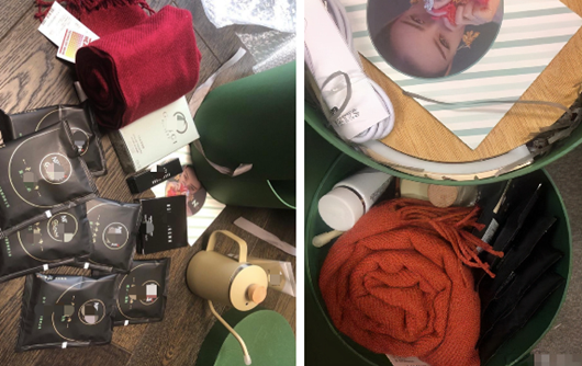 Nghê Ni thể hiện sự chu đáo khi tặng từ hàng hiệu cho đến đồ gia dụng. Set quà tặng của cô bao gồm nước hoa và khăn quàng Gucci, phấn má và son Bobbi Brown, ấm đun nước, đồ ăn vặt,... |