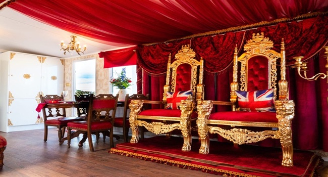 Bên trong khu nghỉ là phòng ngai vàng thu nhỏ mô phỏng căn phòng trong điện Buckingham, nơi Nữ hoàng Elizabeth ở và làm việc. Bộ ghế ngồi được bọc vải nhung đỏ đặc trưng, và đặt thêm gối tựa in hình lá cờ Anh. |