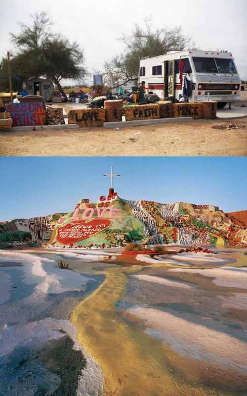 Thi trấn Slab, California, khá gần với các thành phố hoa lệ, nhưng nơi đây không có một luật lệ nào. Thị trấn có 150 cư dân sống nhờ trợ cấp của chính phủ. Đường không có biển báo và du khách chỉ biết là đã đến nơi khi nhìn thấy ngọn đồi nhân tạo Salvation. Thị trấn không có nước sinh hoạt, không có điện, hệ thống cống rãnh, nhà vệ sinh, thùng rác... Họ chỉ có thể mua nước ở các câu lạc bộ đêm bán nước cho khách du lịch.