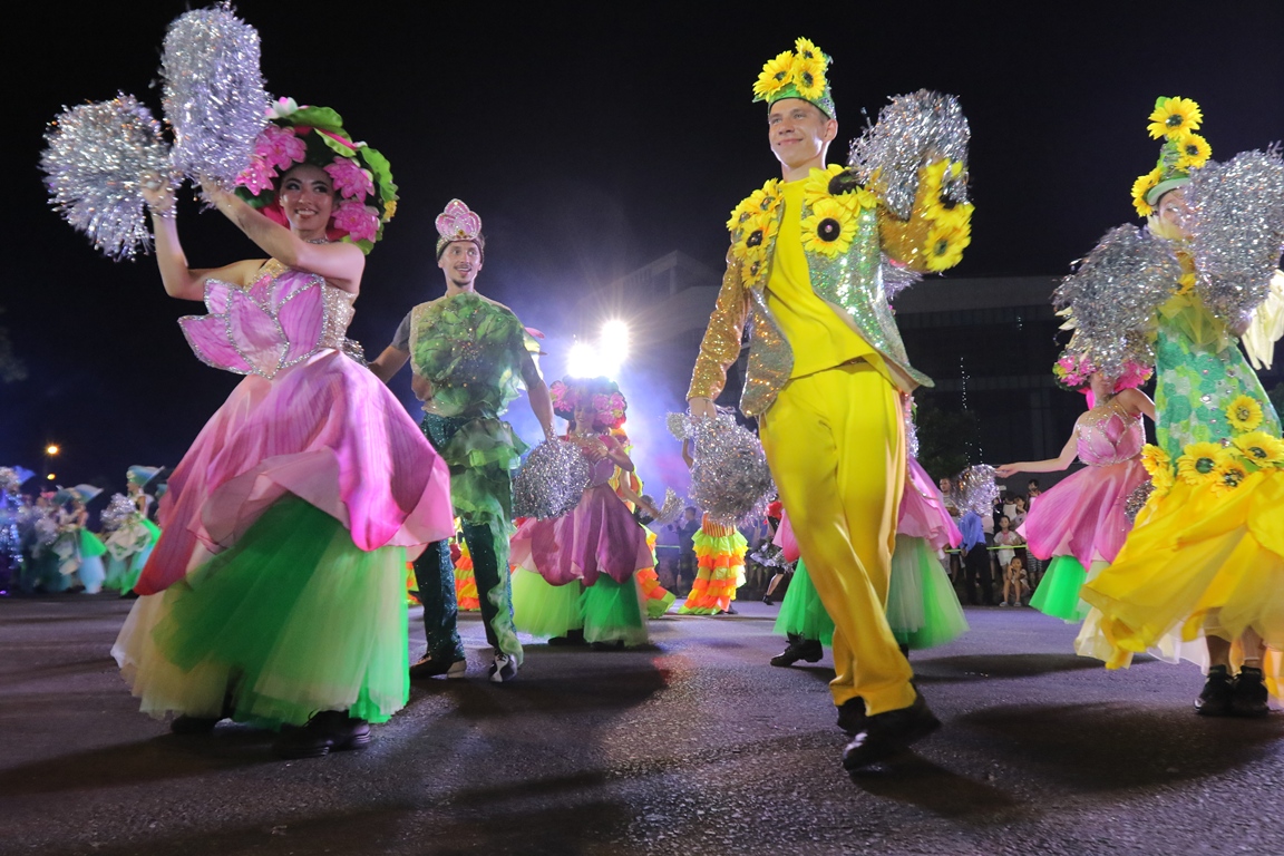 Không gian lễ hội ấy được rót thêm nhiều liều “doping”, các xe hoa rực rỡ tiến vào sân khấu, kéo theo 80 vũ công trong tạo hình loài hoa đặc trưng của 8 quốc gia, “phiêu” theo từng điệu nhảy hoạt náo trên nền các bài nhạc sàn từng khuynh đảo thế giới như Dragostea Din Tei, Macarena…