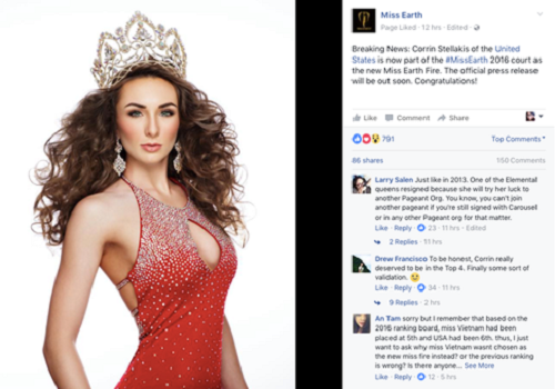 Mới đây ban tổ chức cuộc thi Miss Earth chính thức đưa ra thông báo phế ngôi Hoa hậu Lửa - Á hậu 3 của người đẹp Brazil - Bruna Zanardo tại cuộc thi Hoa hậu Trái đất 2016. Và người được bổ nhiệm cho ngôi vị này là mỹ nhân đến từ Mỹ - Corrin Stellakis.