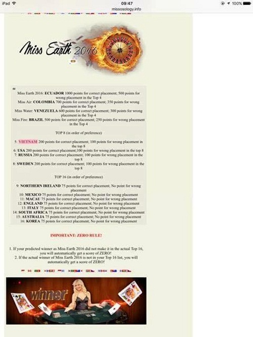| Kết quả của cuộc thi Hoa hậu Trái đất 2016, Nam Em xếp ở vị trí thứ 5, ngay sau Á hậu vừa bị phế truất. |