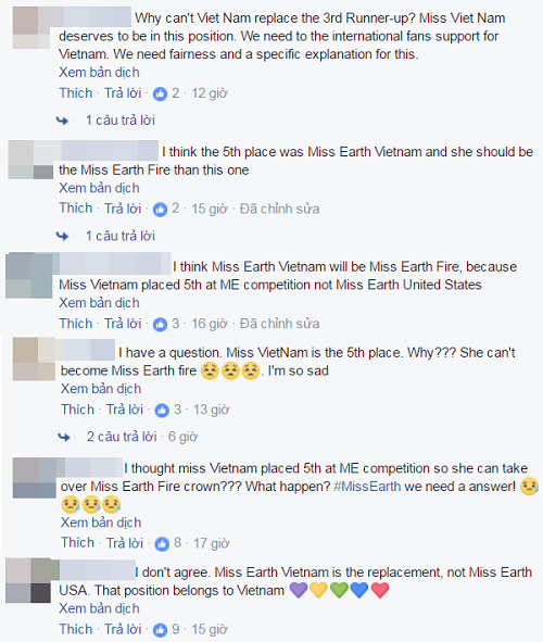 Ngay khi thông tin này vừa được công bố, phần đông khán giả Việt cũng như quốc tế đã lên tiếng đòi công bằng cho đại diện Nam Em của Việt Nam ngay trên trang chủ của cuộc thi Hoa hậu Trái đất.