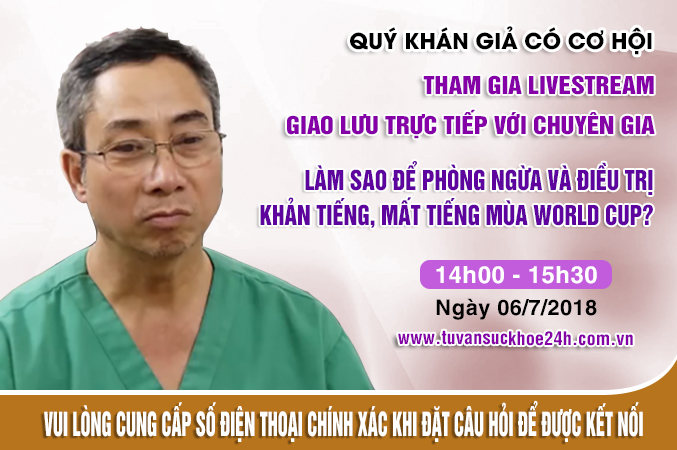 Để giúp quý độc giả hiểu rõ hơn về tình trạng khản tiếng, mất tiếng mùa bóng đá cũng như có thêm cách phòng ngừa hiệu quả từ các phương pháp tự nhiên, Fanpage Tư vấn sức khỏe 24h tổ chức chương trình giao lưu trực tuyến với chủ đề: “Làm sao để phòng ngừa và điều trị khản tiếng, mất tiếng mùa World Cup?”. Chương trình có sự tham gia của BSCKII. Tai Mũi Họng Nguyễn Ngọc Phấn - Bác sĩ cao cấp Đại Học Y Hà Nội.