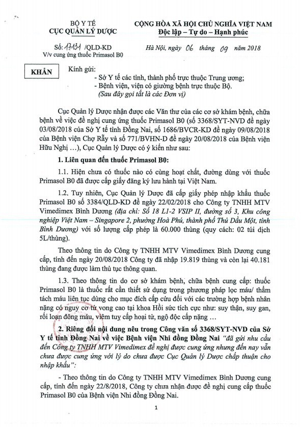 Trước khi chỉ đạo Cục nói rõ, hiện tại, Việt Nam chưa có thuốc nào cùng hoạt chất, cùng đường dùng với thuốc Primasol B0 đã được cấp giấy đăng ký lưu hành. Tuy nhiên, Cục đã cấp giấy phép nhập khẩu thuốc thuốc Primasol B0 cho Công ty TNHH MTV Vimexdimex Bình Dương với số lượng 60.000 thùng (2 túi dịch 5L/thùng). Thông tin từ phía công ty này, hiện đã nhập 19.819 thùng và còn lại 40.181 thùng đang được làm thủ tục thông quan.