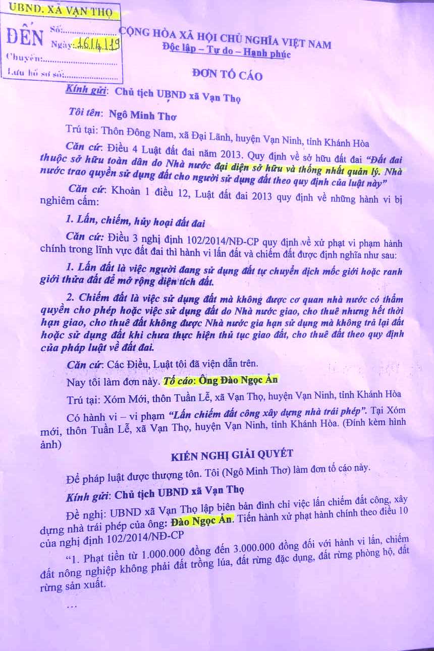 Đơn tố cáo của người dân về hành vi vi phạm của các đối tượng tại huyện Vạn Ninh. |