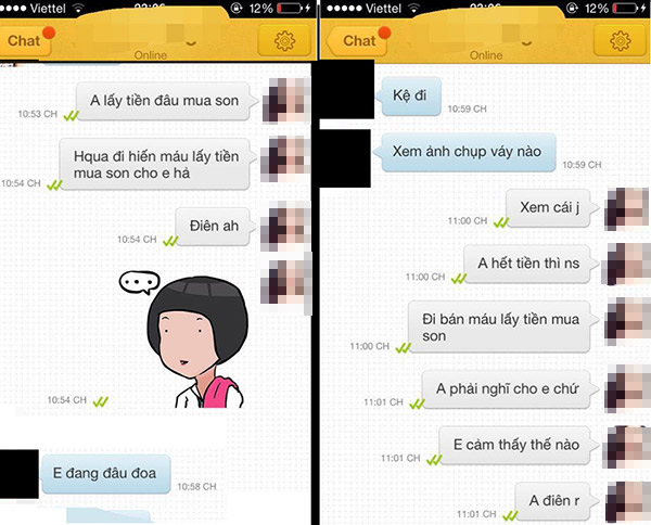 Hình chụp đoạn hội thoại chàng trai hiến máu lấy tiền mua son tặng bạn gái. |