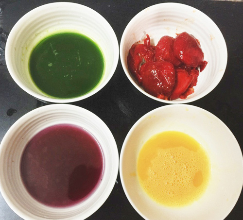 Dầm ruột gấc với rượu trắng để lấy phần thịt gấc, bỏ hạt. Lá dứa, bí ngô, bắp cải tím rửa sạch, cắt nhỏ. Xay nhuyễn mỗi loại với 100ml nước, lọc qua rây và để riêng từng phần.