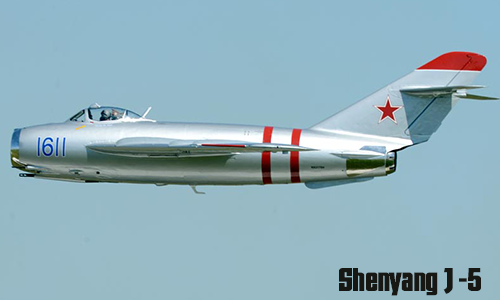 Chiếc máy bay chiến đấu Shenyang J-5 có nguồn gốc từ Trung Quốc, chế tạo năm 1956, dựa trên mẫu Mikoyan-Gurevich MiG-17 Fresco của Liên Xô, đã chế tạo gần 2.000 chiếc. Máy bay có 2 pháo ở mũi. Tốc độ bay tối đa là 1.540km/h, tầm bay 2.200km. |
