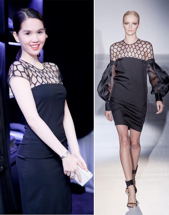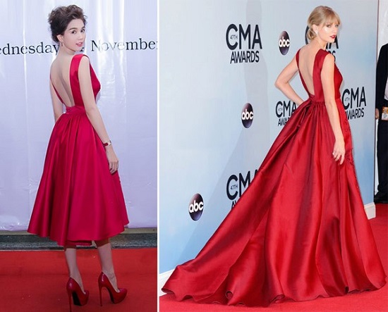 Mới đây, bộ đầm mà Ngọc Trinh mặc giống hệt thiết kế đầm đỏ của Elie Saab thuộc bộ sưu tập Haute Couture Thu 2013 mà Taylor Swift từng diện tại lễ trao giải CMA Awards 2013. Thiết kế giống nhau đến từng chi tiết từ đính đá lấp lánh cùng tông màu, thiết kế trần lưng gợi cảm, điểm khác biệt duy nhất là độ dài của váy.