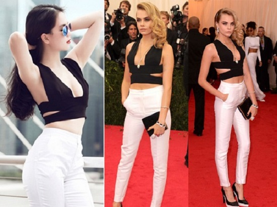 Ngọc Trinh cho biết cô đã sao chép đến 99\% mẫu áo crop top sexy với những đường cut-out táo bạo của hiệu Stella McCartney mà người mẫu Cara Delevingne từng diện trên thảm đỏ trước đó.