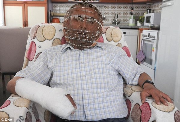 Ông Ibrahim Yücel với chiếc mũ bảo hiểm tự chế của mình. |