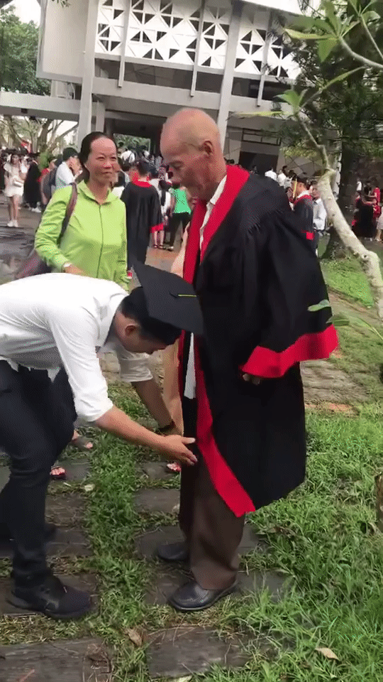 Mới đây, mạng xã hội xuất hiện đoạn clip ghi lại cảnh một nam sinh sau màn làm lễ tốt nghiệp đã đến mặc áo và đội mũ cử nhân cho ông nội khiến nhiều người xúc động.