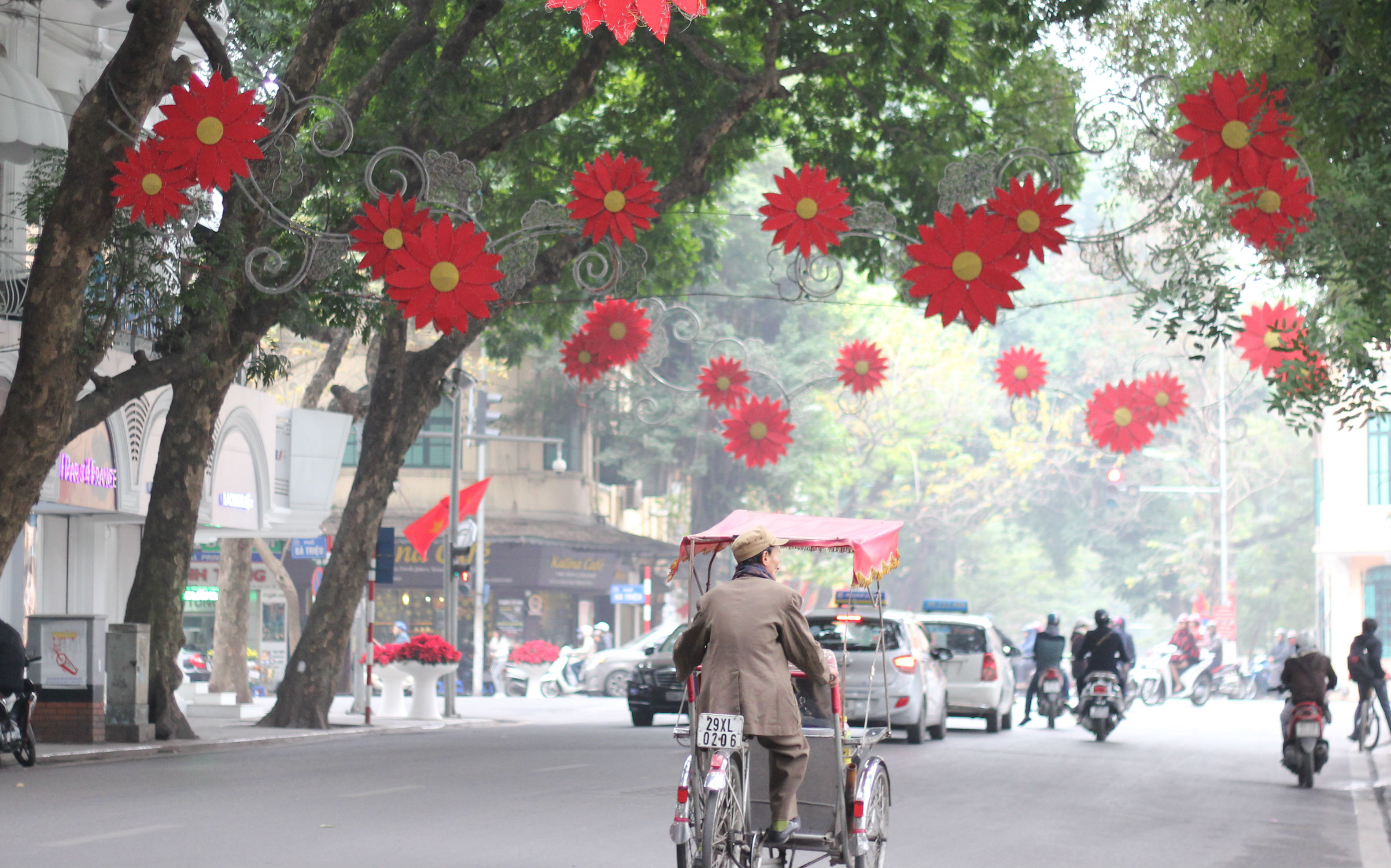 Cụ già đạp xích lô cũng chậm rãi từng bước để cảm nhận không khí Tết đến xuân về trên những con đường của Hà Nội. |