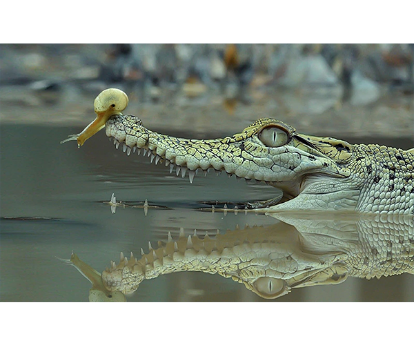 Ốc sên cố trườn lên phía trước mũi “sát thủ” cá sấu để soi bóng mình dưới nước. Ảnh được ghi lại tại đầm lầy ở West Sumatra, Indonesia. Ảnh: Telegraph. |