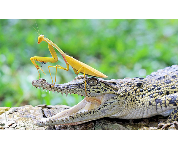 Ốc sên, bọ ngựa thi nhau đậu trên mũi cá sấu.