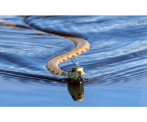 Chú rắn cỏ hung dữ thường ngày nay lại chấp thuận đưa chuồn chuồn qua sông. Ảnh: Telegraph. |