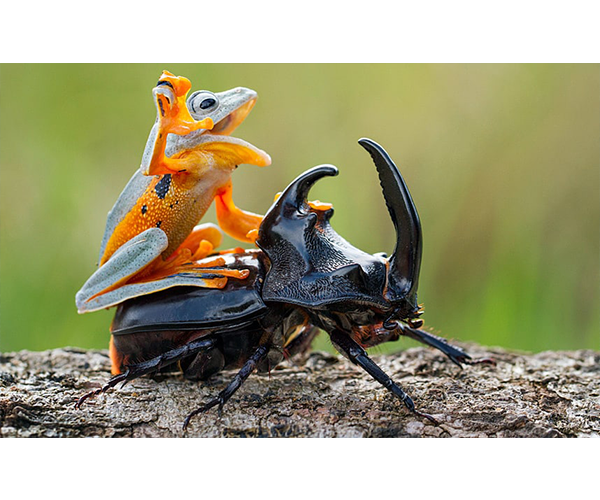 Ảnh ghi lại khoảnh khắc chú ếch cam cưỡi trên lưng bọ gỗ hệt như 1 thủ lĩnh cừ khôi. Ảnh: Telegraph. |