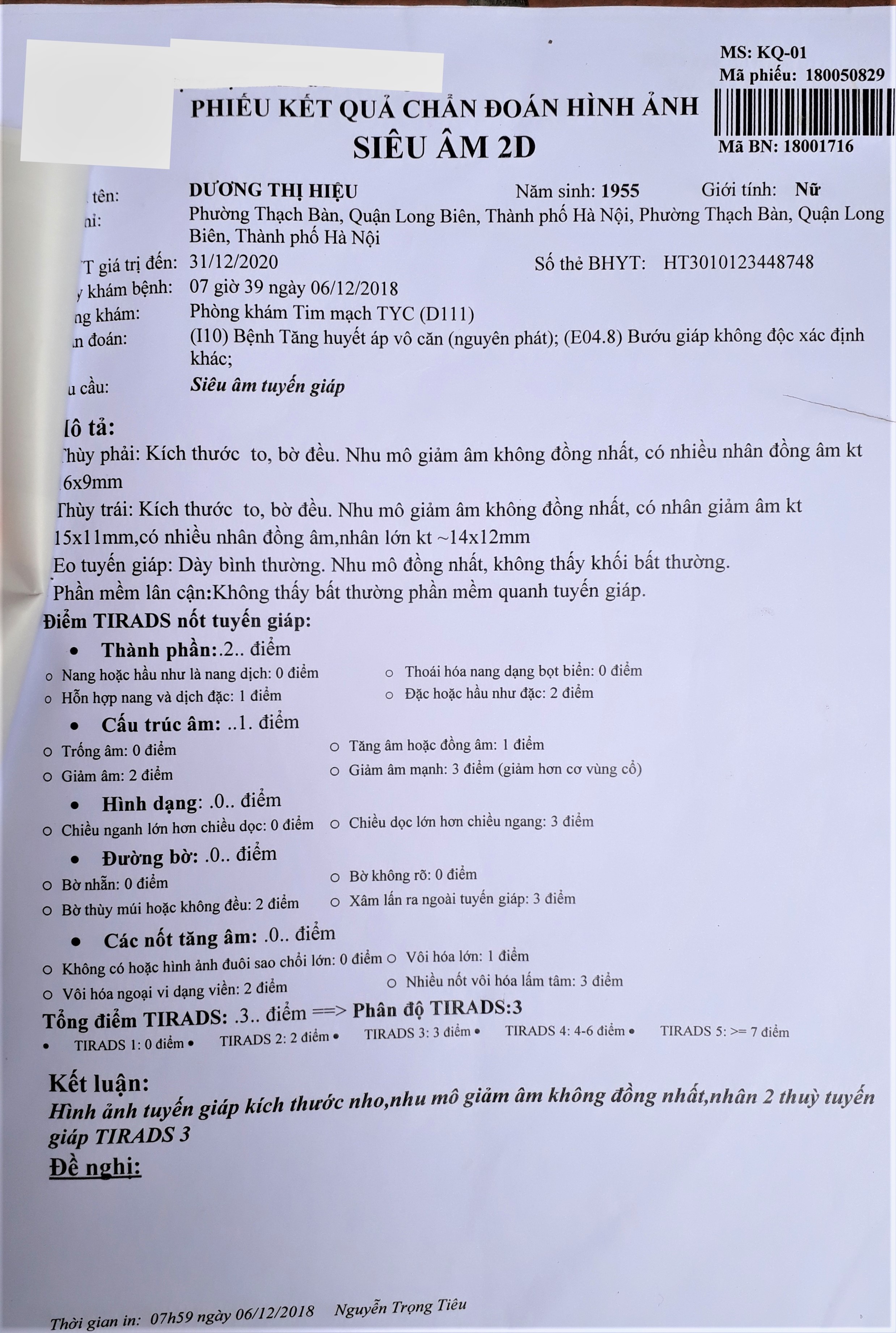 Năm 2016, bà Hiệu được kết luận bị đa nhân hai thùy tuyến giáp (tirads 4). Bà gọi điện cho người cháu làm bác sĩ tại bệnh viện nội tiết để nhờ tư vấn. Sau đó bà quyết tâm mổ vì lúc ấy đã nghỉ hưu rồi. Sau khi làm hết xét nghiệm 1 ngày, bác sĩ bảo không mổ được vì trường hợp của bà bị bướu đa nhân hỗn hợp hai thùy rất to, thùy phải nhân to nhất kích thước là 2,2 x 1,5 cm, thùy trái 2,4 x 2,1 cm và bà lại đang mắc bệnh tim. Bác sĩ bảo, bà Hiệu phải chữa khỏi bệnh tim thì mới mổ được. Sau lần đó, bà đi khám tim và lấy thuốc về uống. Đến năm 2017, bà đi khám lại và được kết luận tuyến giáp phì đại – bướu giáp đa nhân hai thùy tuyến giáp. Kết quả siêu âm cho thấy, kích thước nhân thùy phải tuyến giáp là 1,47 x 1,05 x 1,37 cm, còn nhân thùy trái kích thước 3,23 x 2,48 x 3,63 cm, kích thước bướu to làm bà rất khó chịu.