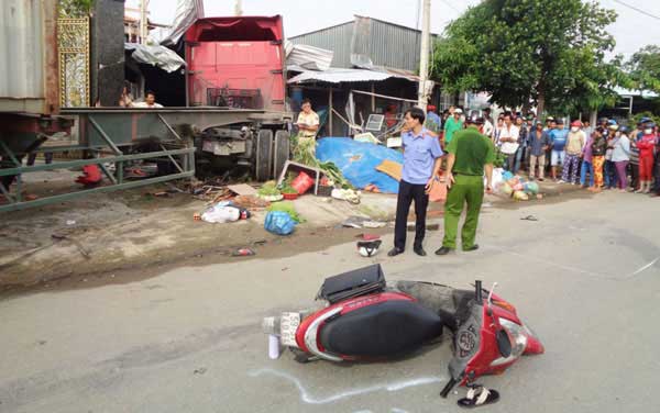 Tai nạn làm bé gái 5 tuổi đang chơi trong nhà tử vong tại chỗ, 5 người khác bị thương, 2 xe máy bị hư hỏng. Sau khi gây tai nạn, tài xế container rời khỏi hiện trường.