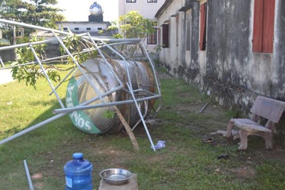 Tại hiện trường, bồn nước bằng inox loại 2.000 lít cùng tháp đỡ bằng khung sắt bị gãy oặt xuống. Cạnh đó là chiếc ghế đá bị vỡ, nơi có hai học sinh ngồi chơi trước khi bồn nước đổ sập.