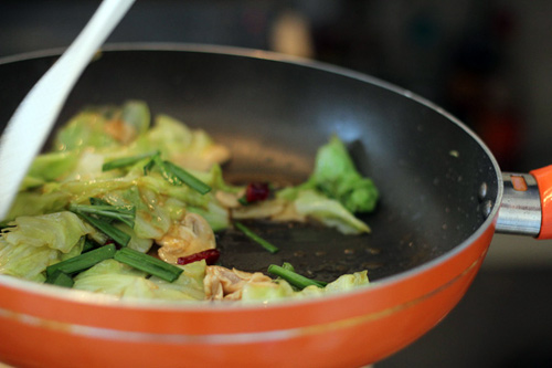 - Bước 2: Thêm nấm và bắp cải vào xào thêm 4-5 phút hoặc cho đến khi bắp cải trở nên mềm.