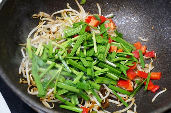 - Bước 3: Thêm miến, nước tương, dầu hào, giấm vào đảo nhanh tay rồi thêm hẹ vào đảo qua.