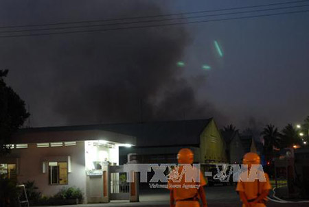 Đến 18 giờ 45, khói đen vẫn bốc lên nghi ngút tại khu xưởng công ty TNHH Quốc tế Hoàng Việt, lực lượng PCCC đang nỗ lực dập lửa, không để cháy lan sang khu vực xung quanh. Ảnh: Mạnh Linh-TTXVN |