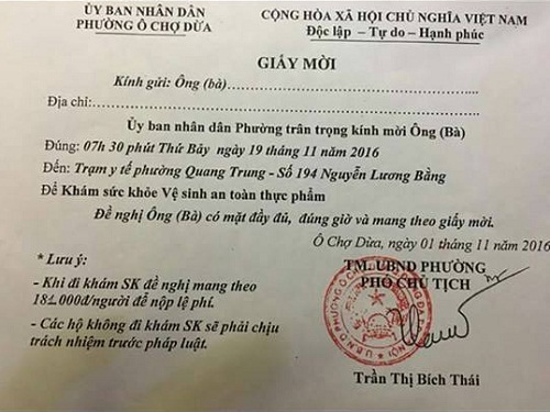 Nhiều ngày qua, người dân phường Ô Chợ Dừa (Đống Đa, Hà Nội) phản ánh về thông tin việc UBND phường này gửi giấy mời họ phải đi khám sức khỏe vệ ATVSTP tại trạm y tế kèm thu phí gây bức xúc dư luận.