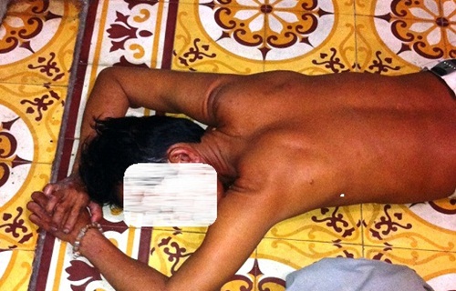 Ông Hoàng nằm vật xuống sàn nhà sau khi quậy ở đám cưới nhà hàng xóm (Ảnh: Dân trí) |