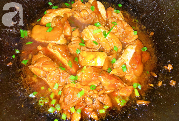 - Bước 5: Đun đến khi sốt sệt thấm đều vào gà thì cho hành lá thái nhỏ vào rồi tắt bếp.