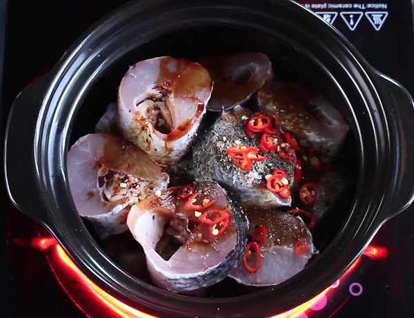 - Bước 4: Khi nồi cá sôi vặn nhỏ lửa, để cá chín từ từ và mềm hơn, khi nồi cá gần cạn thì nêm nếm thêm gia vị cho vừa ăn rồi đun tiếp.