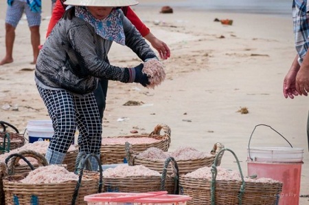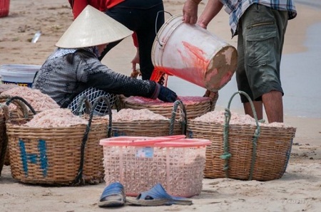 Chúng tôi lảng đi ra xa và gặp thêm một tốp nữa vừa khuân vác những giỏ ruốc tươi rói trắng ngà từ thuyền thúng lên bờ. Họ lại tiếp tục quát mắng chúng tôi mặc dù chúng tôi ko cầm máy chụp nữa.
