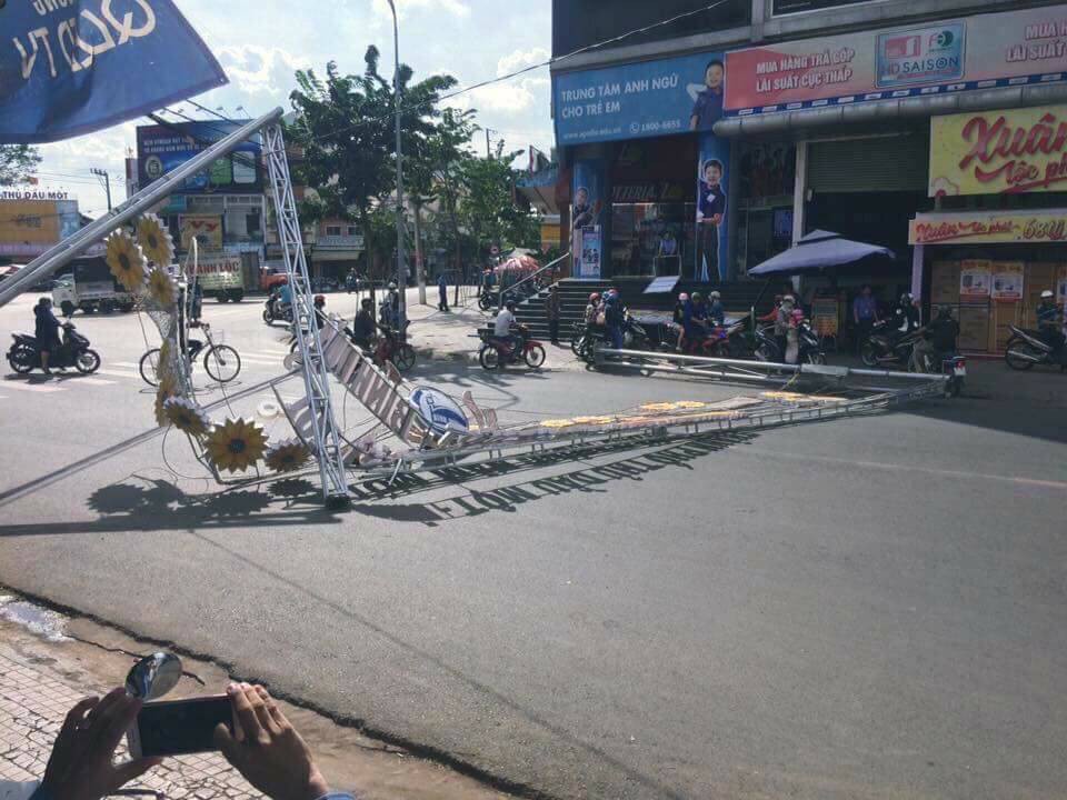Theo quan sát, công trình đèn hoa được thiết kế bằng nhiều khung sắt thép dài khoảng 50 mét, nặng hàng tấn bắc ngang qua khu vực đường Trần Hưng Đạo, gần khu vực vòng xoay ngã 6 TP Thủ Dầu Một bị đổ, nằm ngổn ngang giữa đường, nhiều khung sắt bị bung mối hàn, ốc vít cố định trụ sắt bị rơi ra ngoài.
